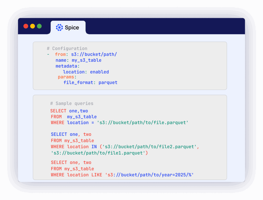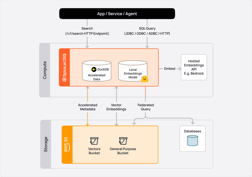 Developers can make vector searches using SQL or HTTP and combine similarity search with relational predicates and joins. Spice pushes filters down to S3 Vectors to minimize data scanned, delivering scalable sub-second query performance with the flexibility of SQL.'