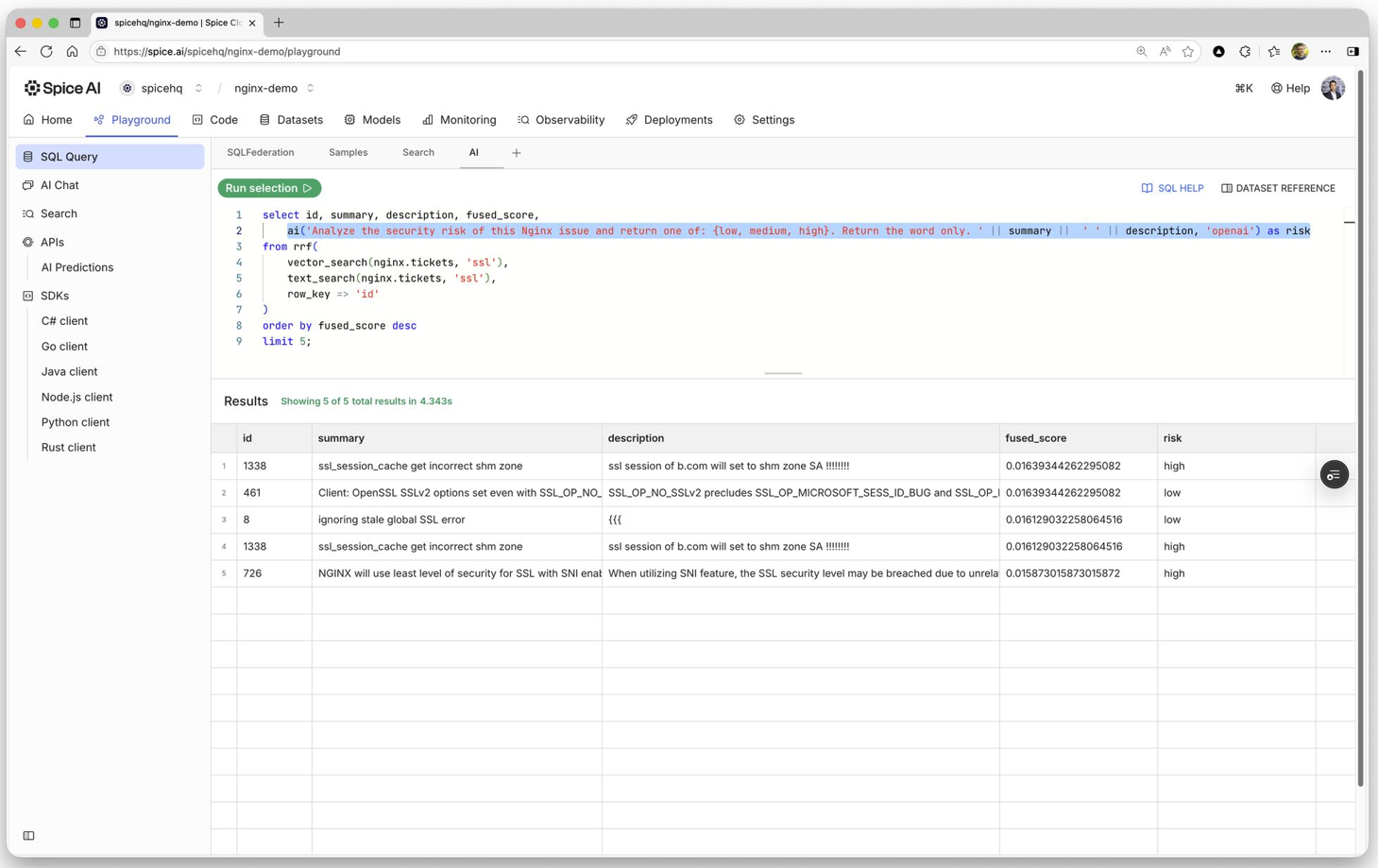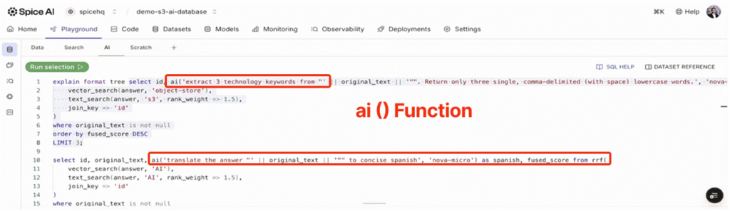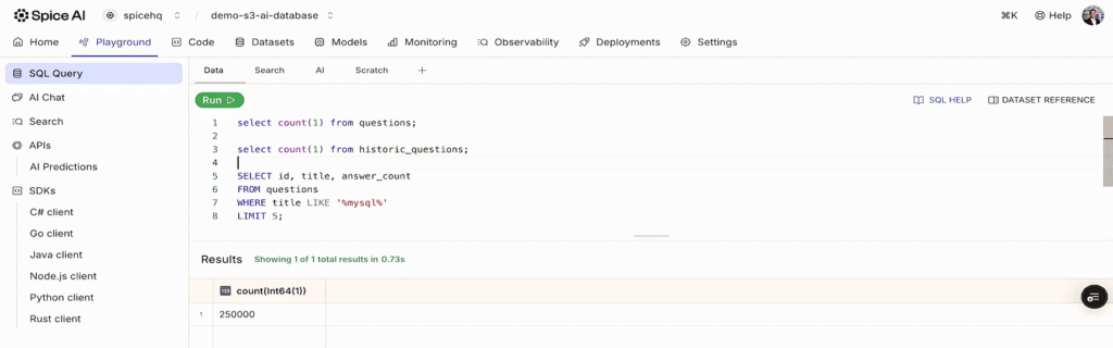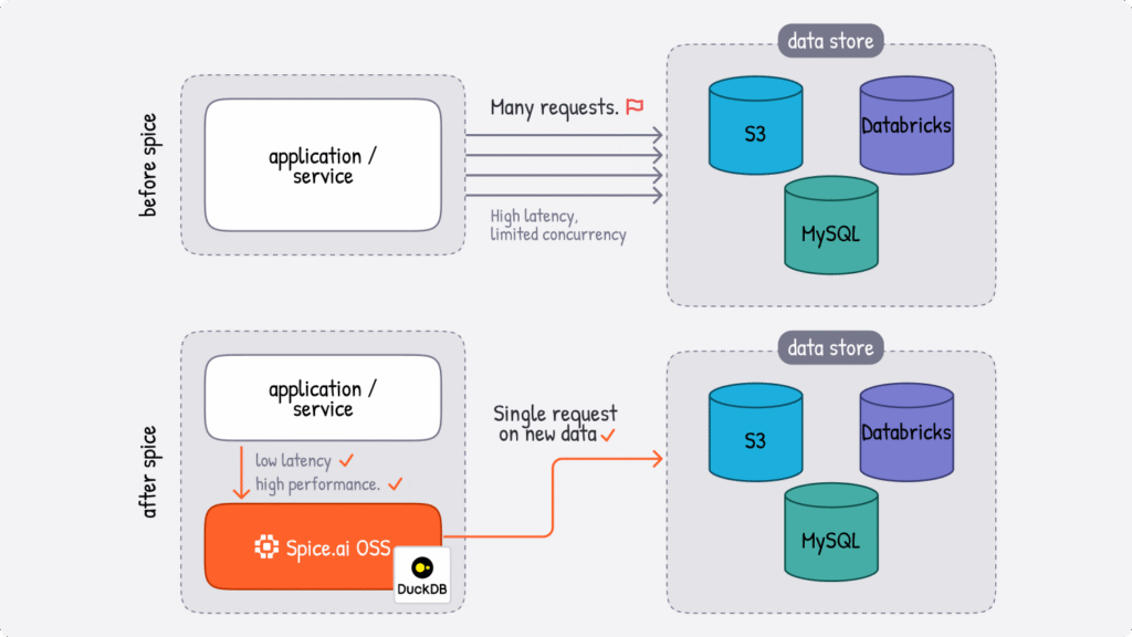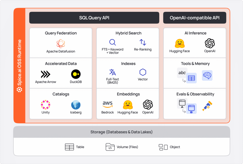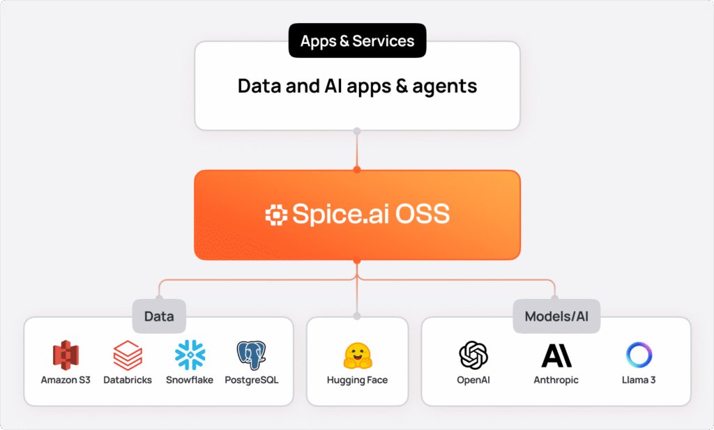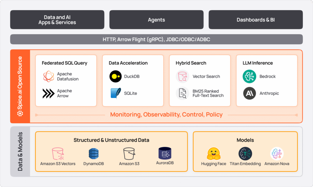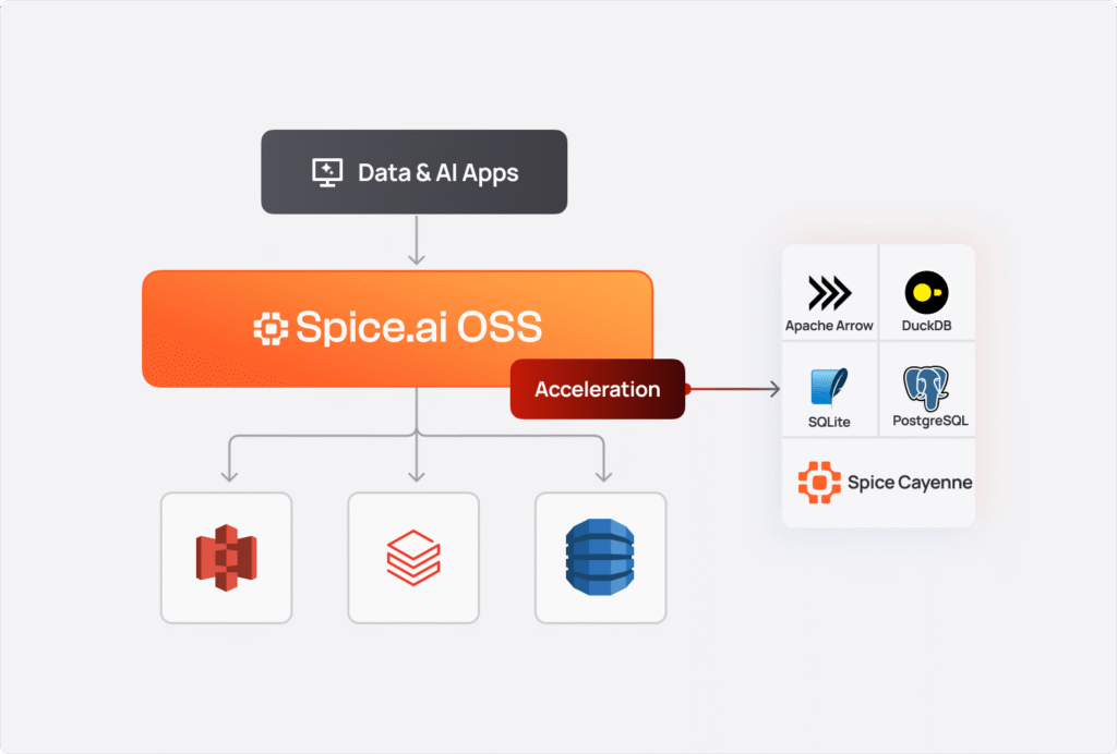 These data and AI workloads impose fundamentally different demands on the data layer than previous generations of applications. Instead of the complexity of multiple query engines, search platforms, caches, and inference layers, Spice brings this functionality into a single, high-performance data and AI stack. Development teams can query operational databases, data lakes, analytical warehouses, and more with a single SQL interface, while taking advantage of built-in acceleration, hybrid search, and AI.'