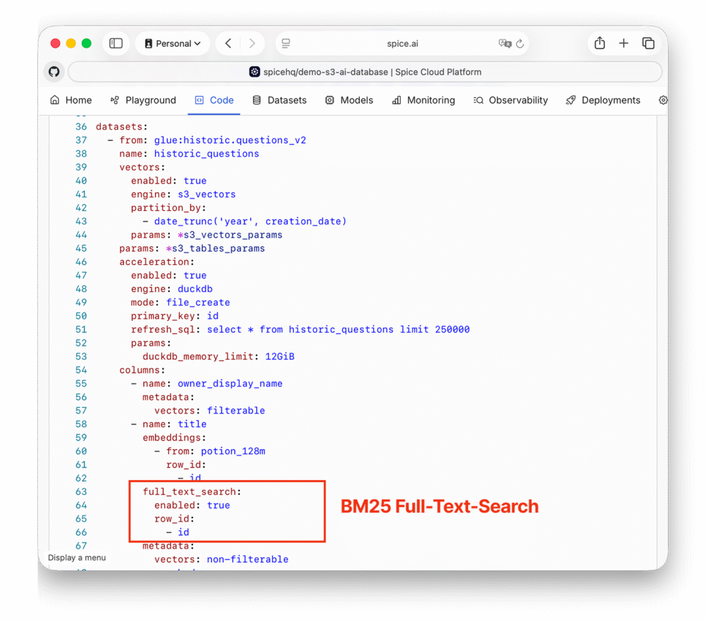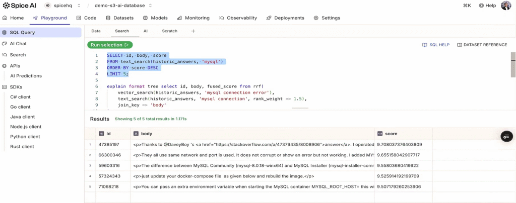 AI applications are only as effective as the data they can retrieve and reason over. Beyond extracting data, they need to search across both structured and unstructured sources to surface the most relevant context at query time. In 2025, search evolved into a core primitive of the Spice platform, designed to operate natively across federated datasets.'